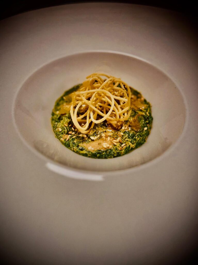Japanese Spinach Gomae Salad, Crisp Egg Noodle Nest