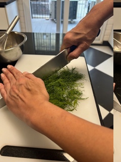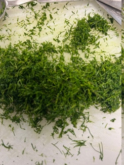 Then dry the dill on kitchen towels, (STEP 2) or cloth towels reserved for such use, and finely chop (STEPS 3 & 4). You will need 2 tablespoons i.e. 30g of finely chopped dill for one recipe one of sauce.