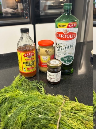 Apart from dill, which I buy from Pindi Fruit Mart, 28-A, Main Market, Defence Colony, New Delhi 110024, you will need a good quality mustard, which essentially means an imported Dijon mustard, apple cider vinegar (for the purpose of health & happiness, I suggest the organic Braggs brand that is widely available in grocery stores stocking imported goods), imported extra virgin olive oil (irrespective of brand) and honey, of which there are numerous good local brands available.